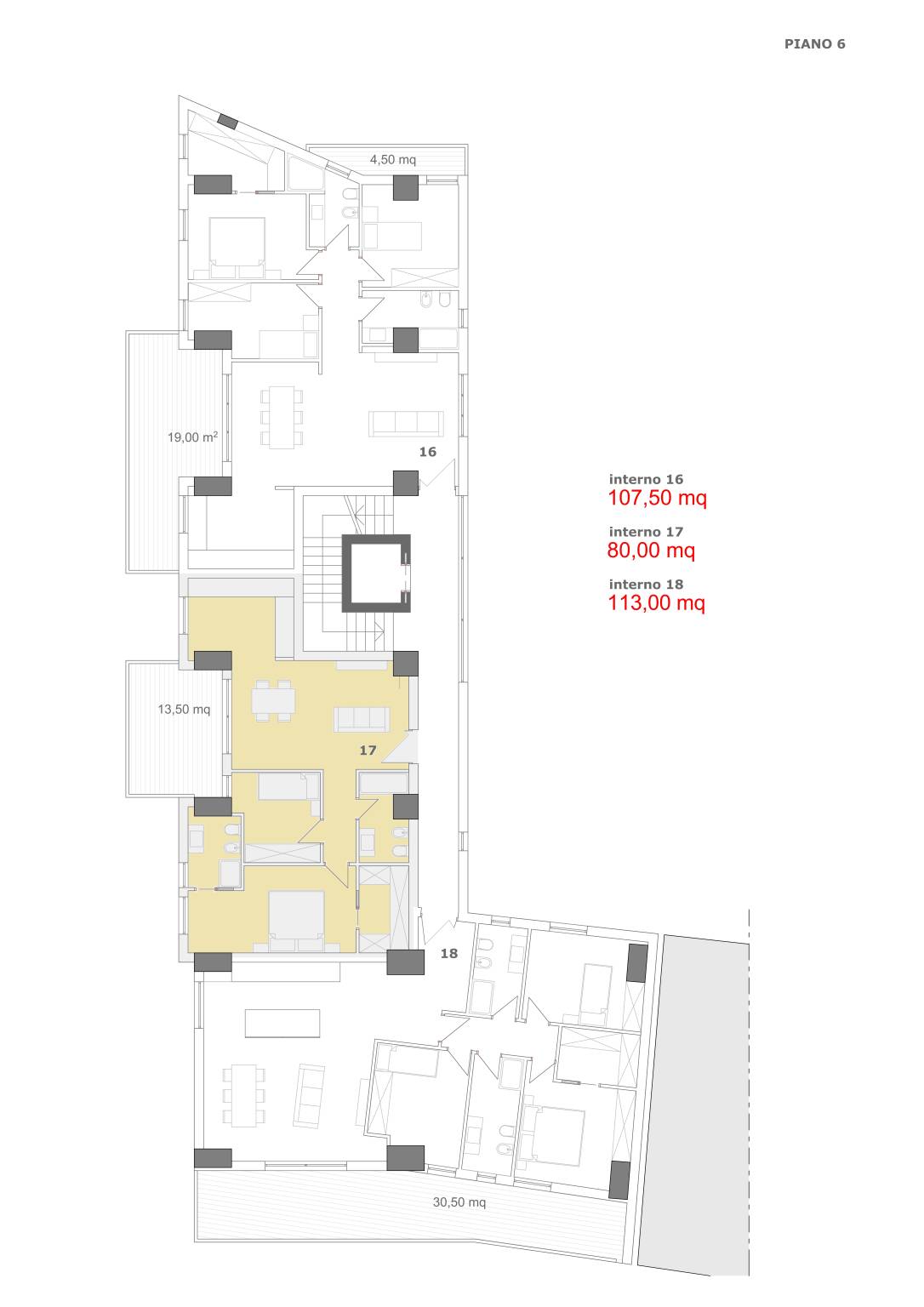 | Terrazza - 6° piano | 14 Mq | 14 Mqc |